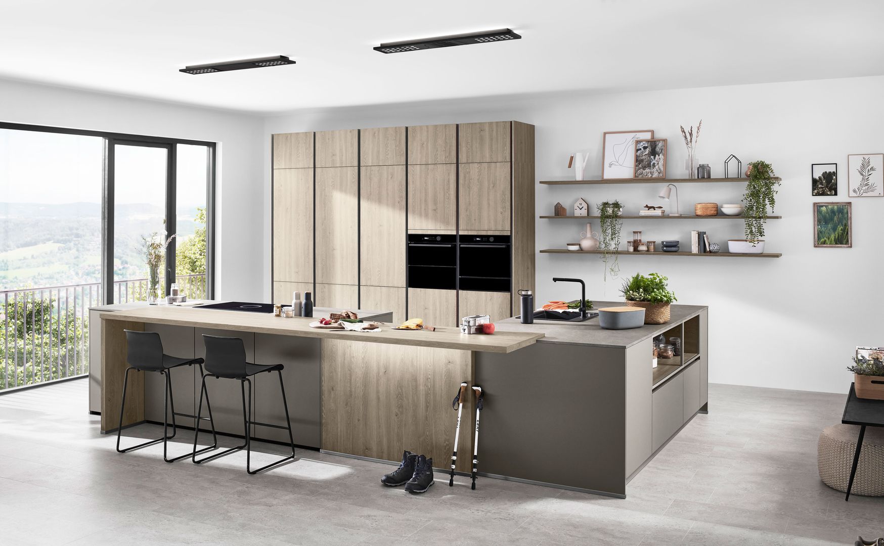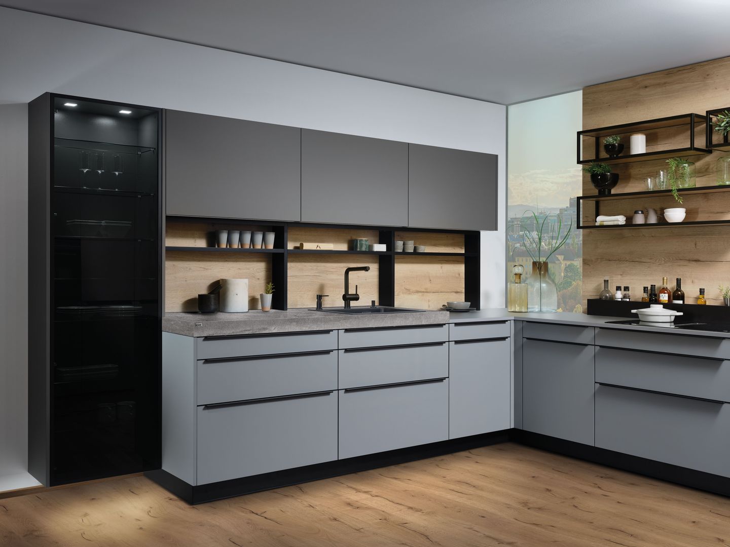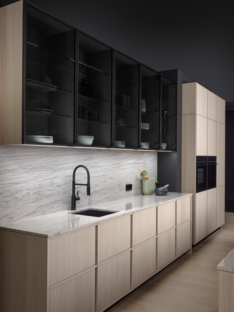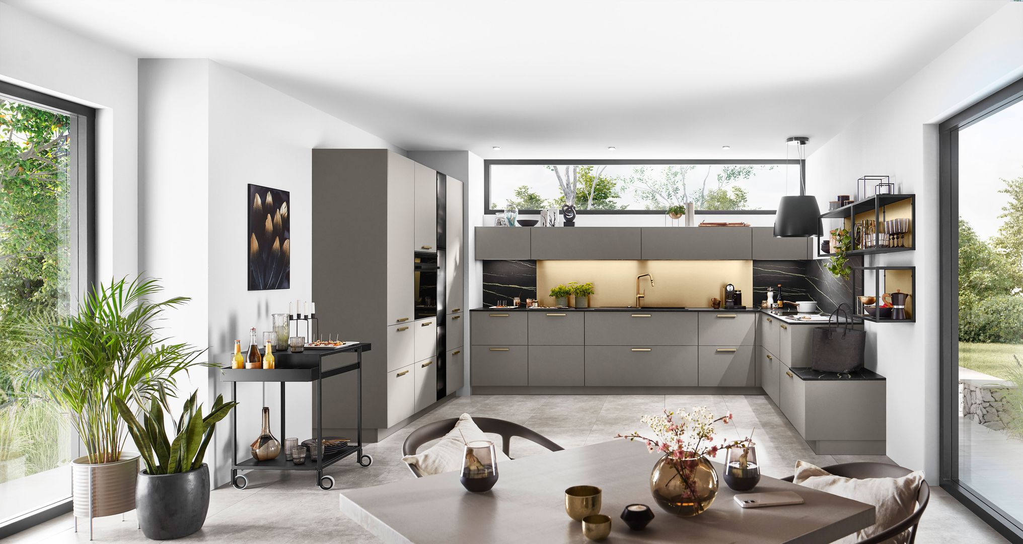 Wie sieht die Küche in den 2020-er Jahren aus? Eines ist klar: Sie ist offen für Neues. Offenes Wohnen ist so aktuell wie nie zuvor, und die einzelnen Lebensbereiche verschwimmen. In der Küche wird gearbeitet, gustiert und gekostet, auch gegessen, gechillt und verweilt. Das nicht mehr so wie vor einigen Jahren meist in klinischem Weiß, sondern in eher dunkleren Tönen. Dabei reicht der Bogen von Anthrazit über Mitternachtsblau und Tannengrün bis zu dunklen Hölzern, in die sich immer wieder ein neuer, leichter Rosé Ton mischt und für frischen Wind sorgt. Diese Farbwelt ist oft matt, in Anti-Fingerprint Optik, meist grifflos und mit vielen praktischen Details gespickt. Es gibt unzählige Varianten, um typische Küchenhelfer verschwinden zu lassen, die dann mit einem Handgriff sofort parat sind. Die Zeiten, in denen die Küche offensichtlich mit ihren technischen Hilfsmitteln geprahlt hat, sind Schnee von gestern. Alle Linien sind klar und puristisch. Die Küche beeindruckt als stylishes Designmöbel und Blickfang zugleich.